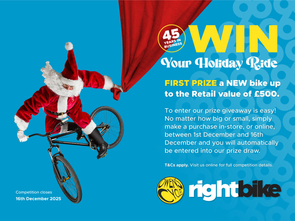 The ‘45 years in business – Christmas Bike Prize giveaway’ runs from Monday 1st December 2025 and ends on Tuesday 16th December 2025 at midnight.